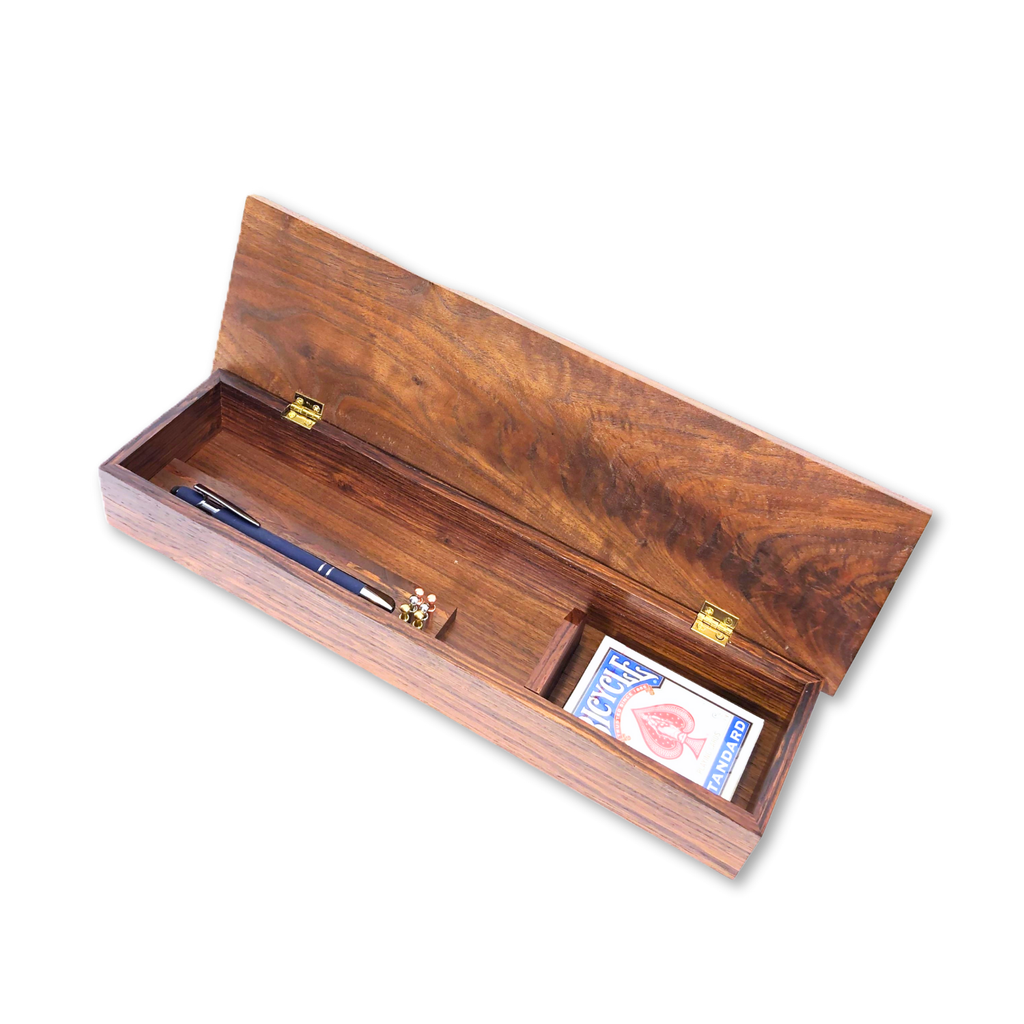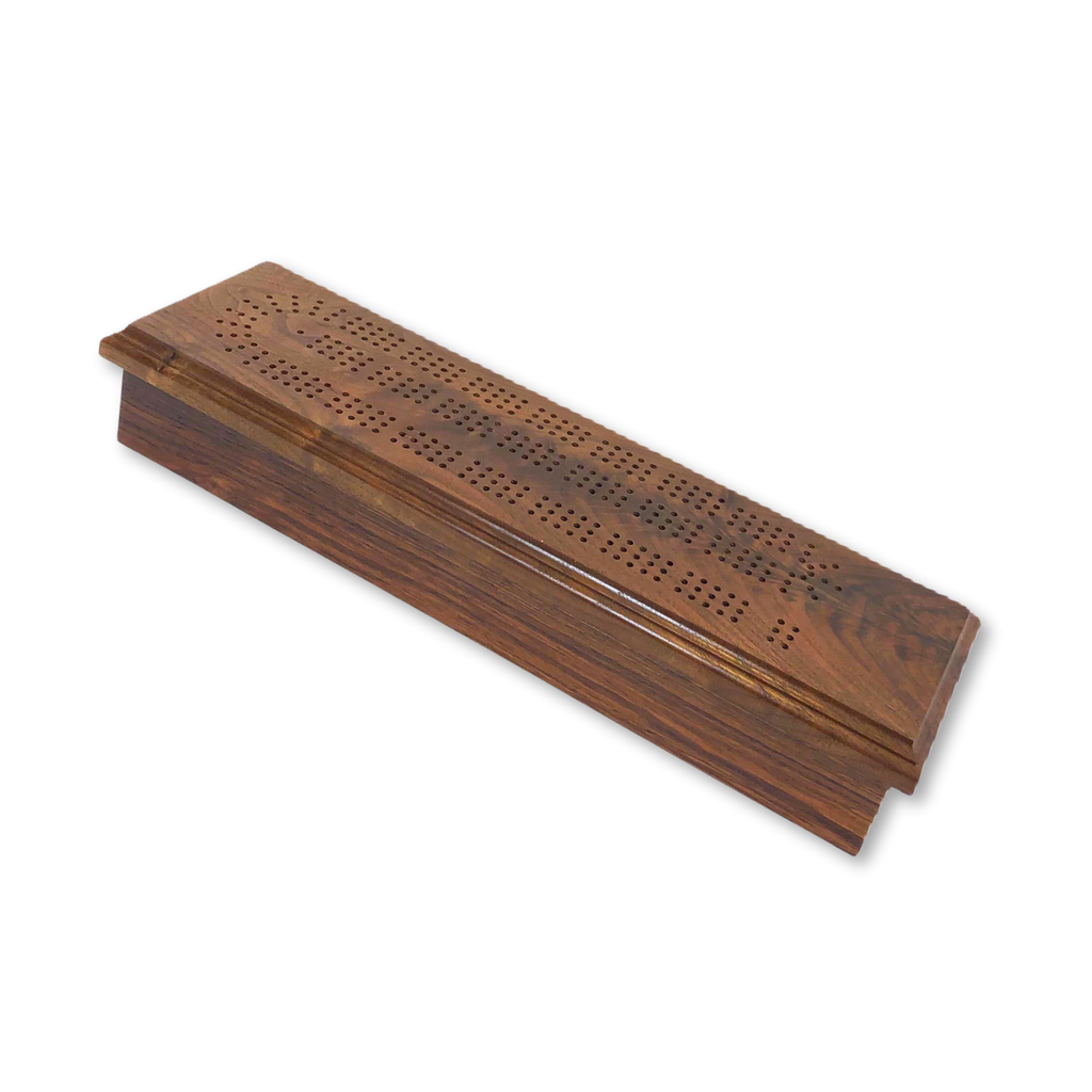 This rosewood and walnut cribbage board is 15.5 long by 4.5 inches wide. Include pins and deck of cards. Your purchase will include a card about the artist.