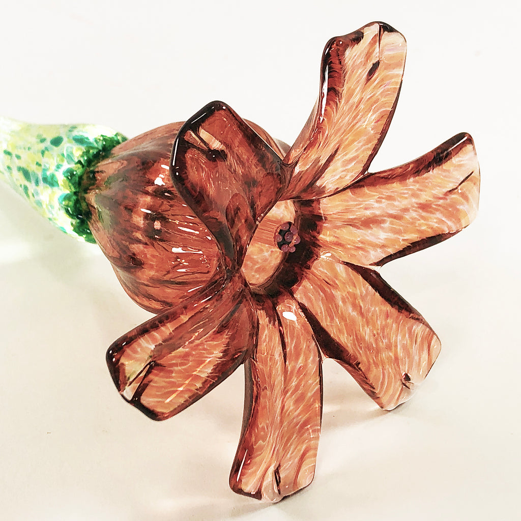 This beautiful glass flower is sure to make your heart bloom with love! Each flower ranges from 12-14 inches tall and is around 3 inches wide. They make a lovely addition to any shelf or vase alone but are very striking as a collection. Each item is handmade and may differ from the color and texture shown in the photos. Gift wrapping options available.