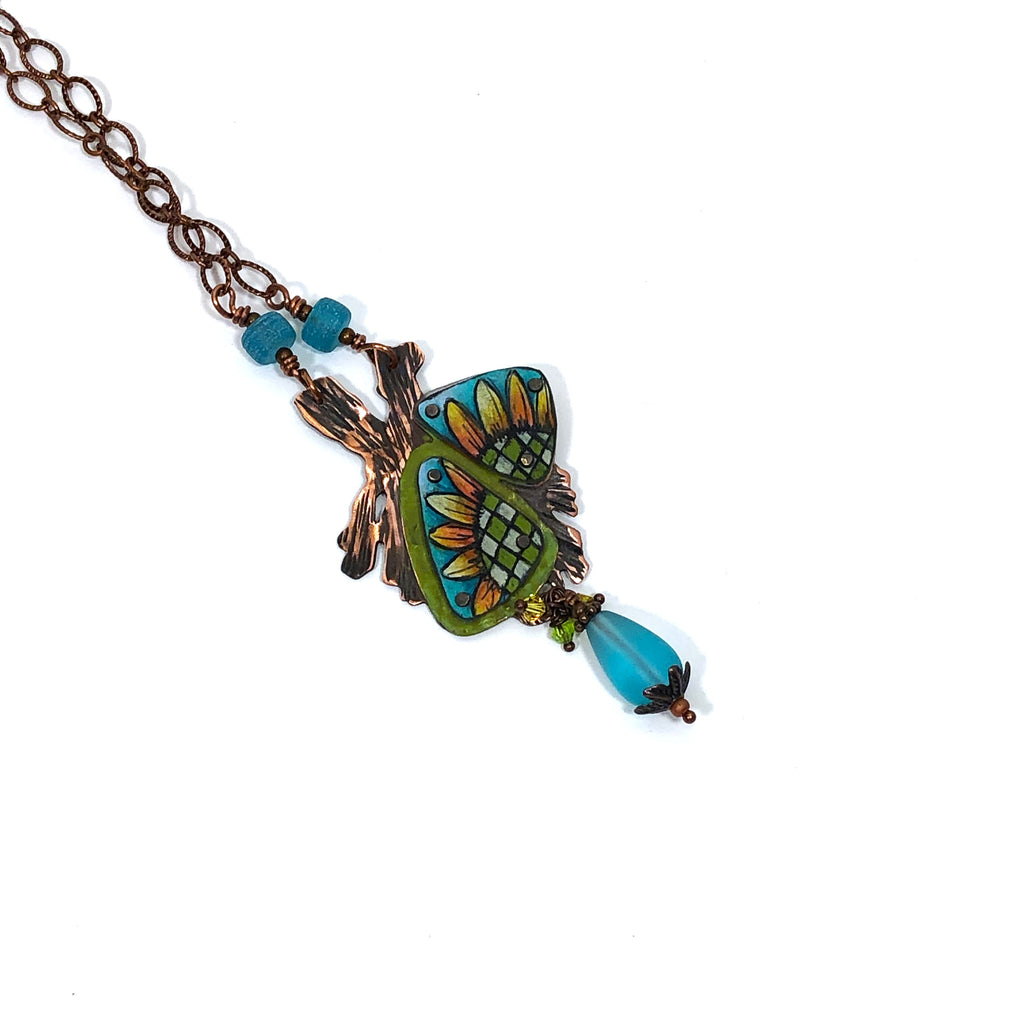 This one-of-a-kind mixed media pendant is created from copper, sealed drawn "Shrick" art and beads. An artist card will be included.